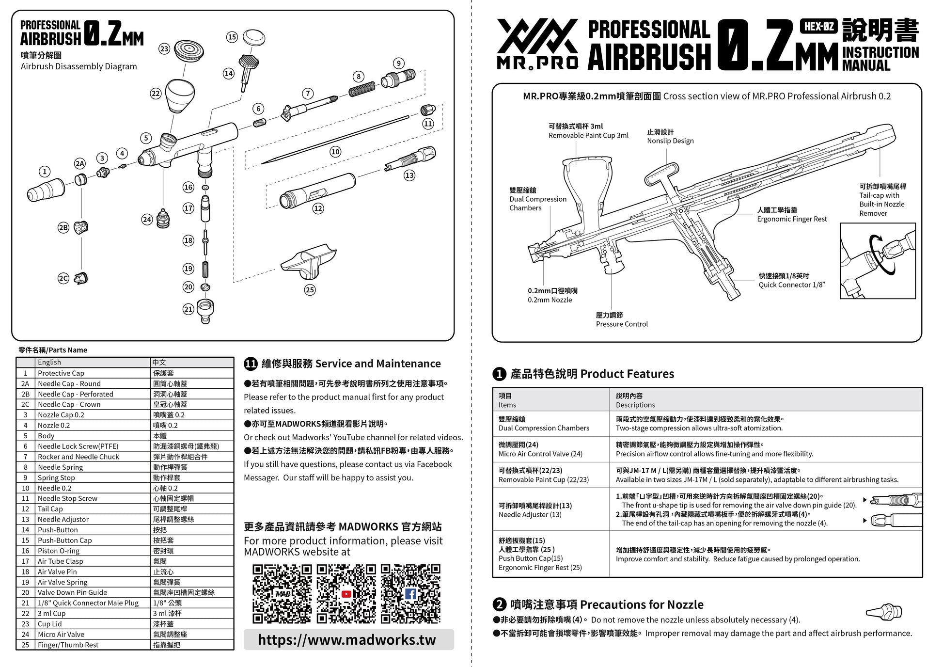 A synergy between aesthetic and practicality: Hexagon (Hex) is the design theme of this airbrush – the head cap hex ring; the hex micro air control valve; the unique hex handle cutout; the comfortable hex grip; and most importantly, the hex lever. Both aesthetic and comfort are incorporated into the design! We’ve thought it through for you!